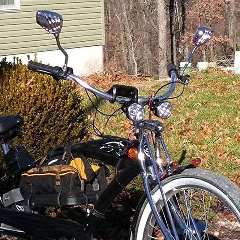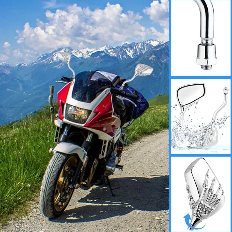 • Utmerket kvalitet: Levende skjelettutseende, høykvalitets forkrommet ABS-skall/klart speilglass/forkrommet stålstamme, høystyrke, lette, lette produkter kan effektivt redusere belastningen på motorsykler, noe som gjør kjøringen enklere. Det kan effektivt motstå regnerosjon og forhindre rust. Hjelp rytteren til å kjøre i regn/snø, dårlig vær.
