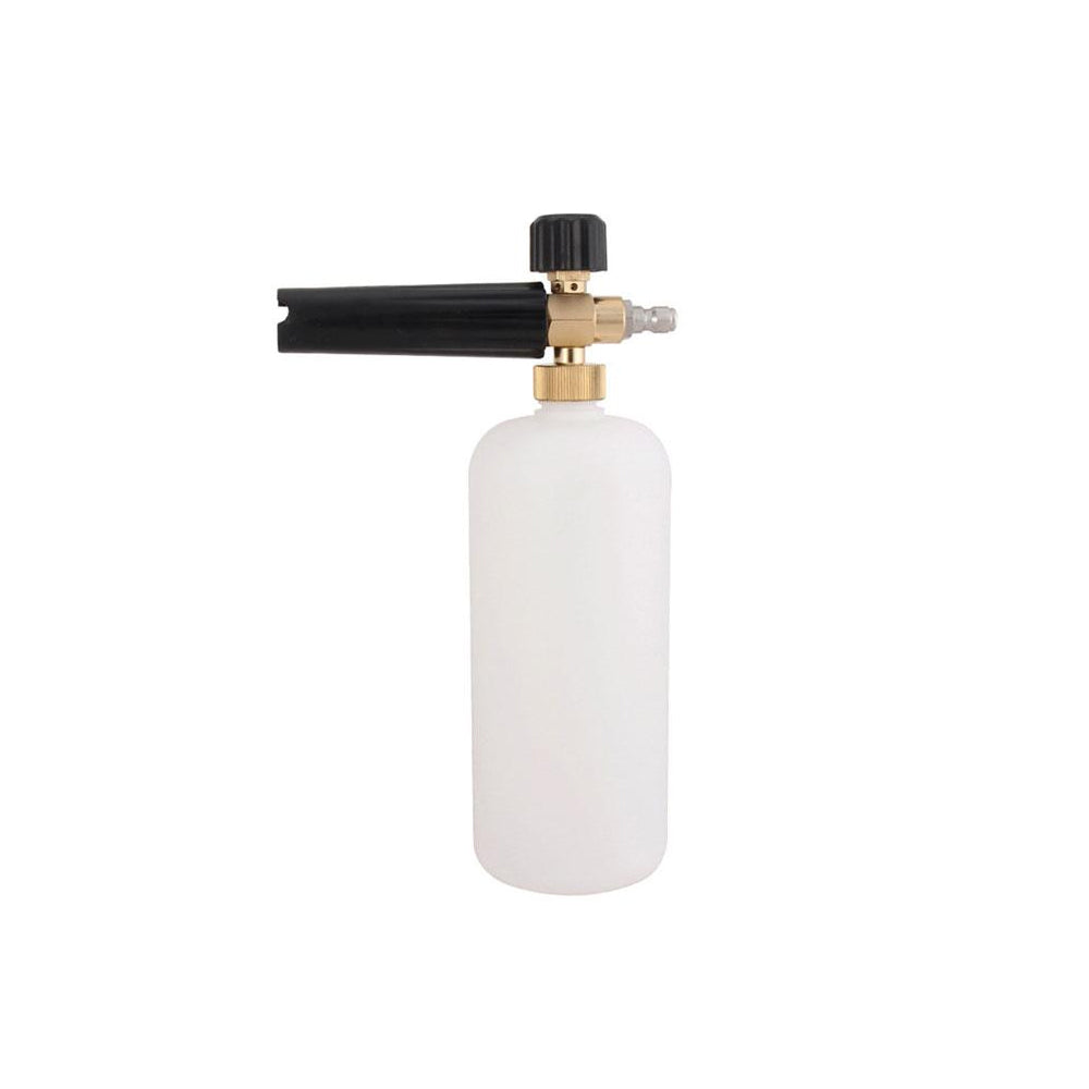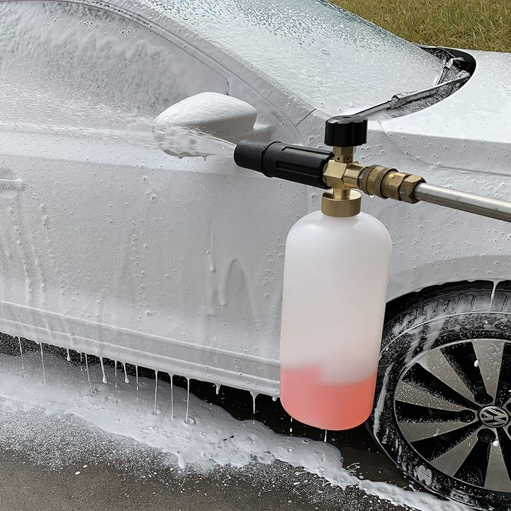For det første kan du fylle litt såpe i flasken med varmt vann for å få tykt skum; For det andre, bruk 1/4" hurtigkoblingsplugg for å koble til høytrykkspyler eller stav; Til slutt justerer du knappen på toppen til ønsket skumnivå og vil deretter spre tykt skum. Knotten justerer skumdispenseringsmengden og munnstykket justerer strøingen mønster.