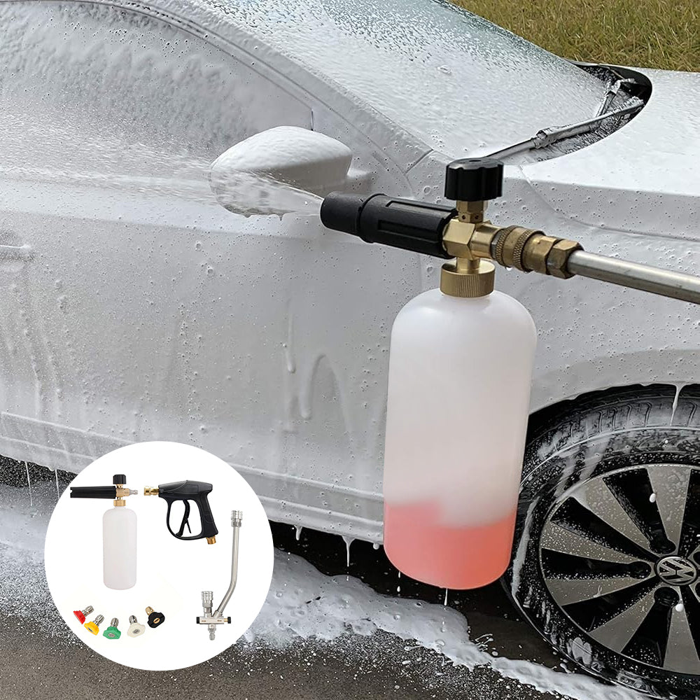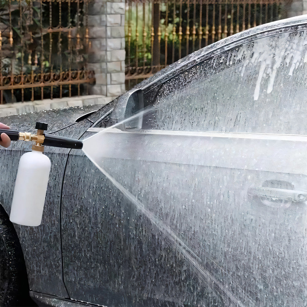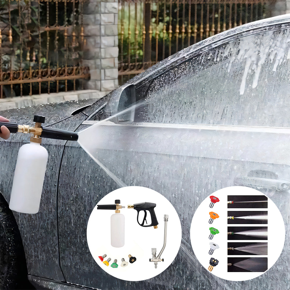 Forvandle din rengjøringsrutine med vårt innovative skumblaster-tilbehør med doble koblinger, designet for å koble til en høytrykksvaskerdyse og snøskumkanon samtidig.