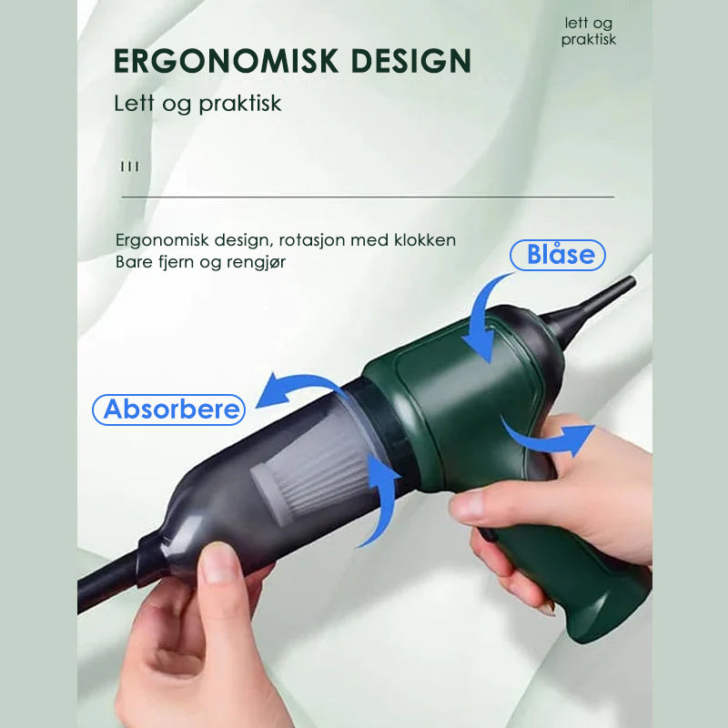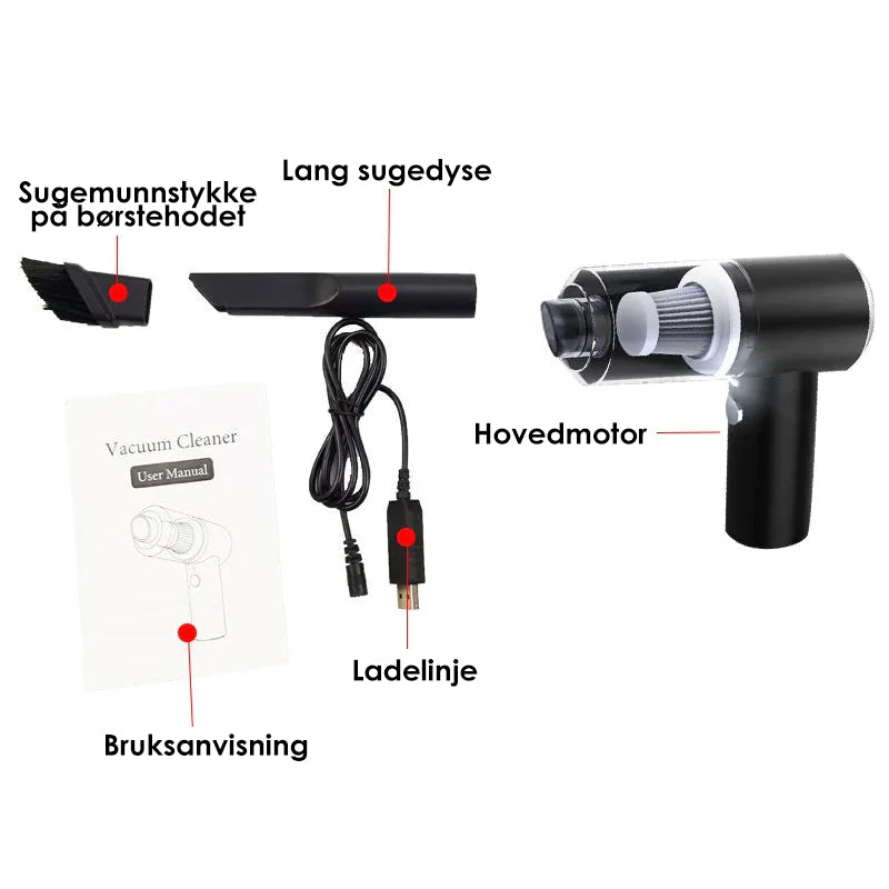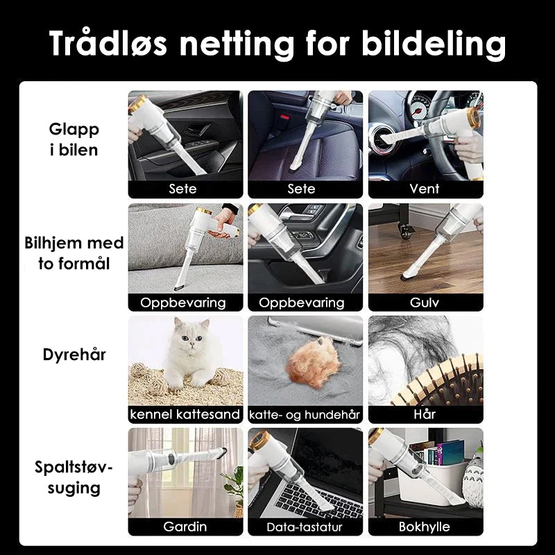 Lett og kraftig betjening: Kompakt design, lett og håndholdt, men sterk suge- og støvsuger. Utgangseffekt 30W superkraftmotor gir sterkt sug opp til 5000pa, våt/tørr vakuum, lettvekts kun 365g.