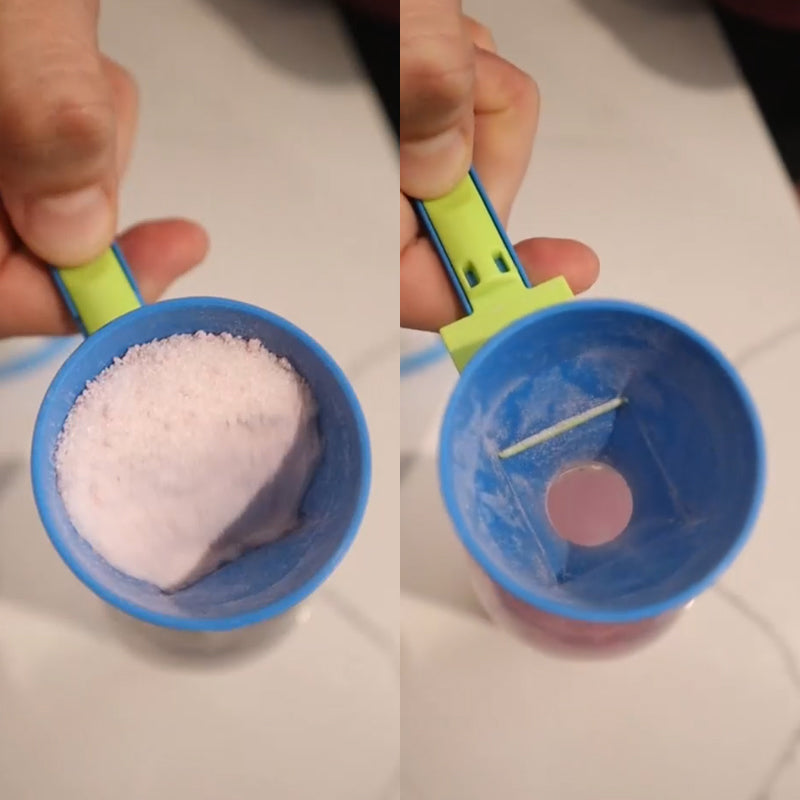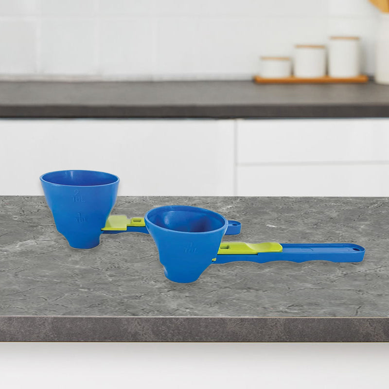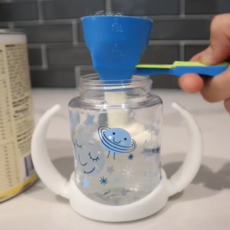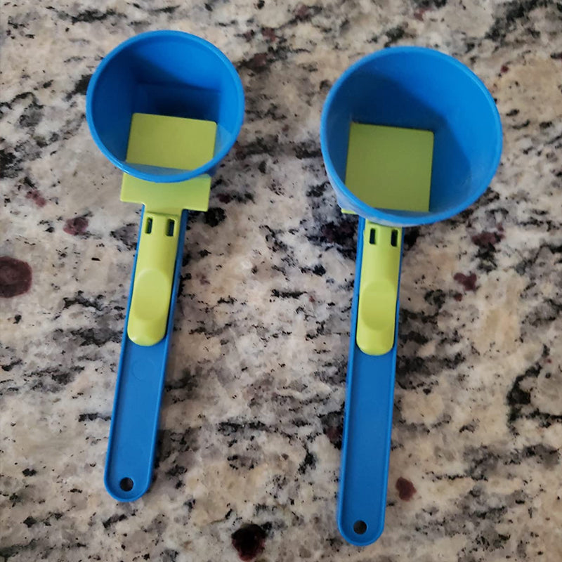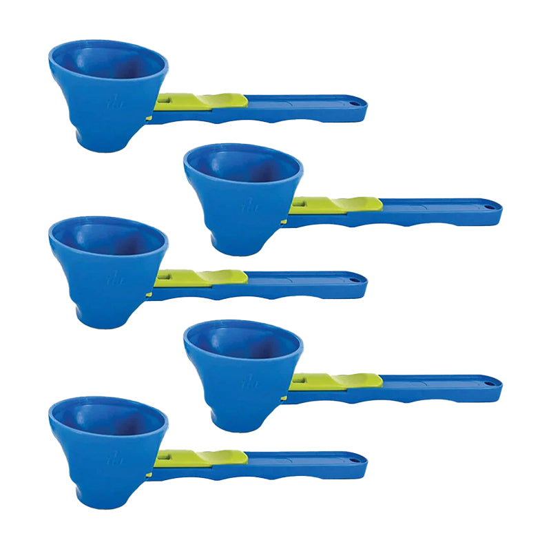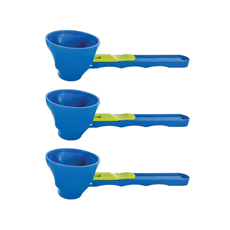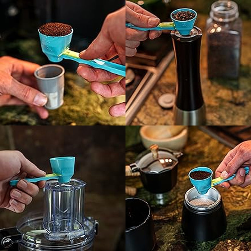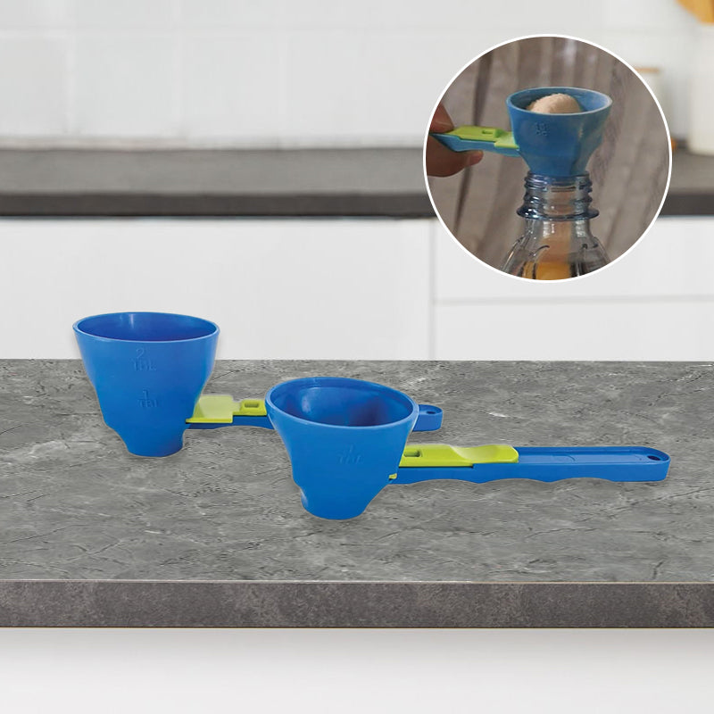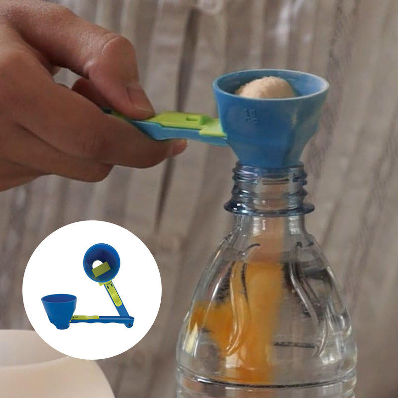 Nøyaktig mål og sølfri scoop og trakt briljant kombinert i én dings