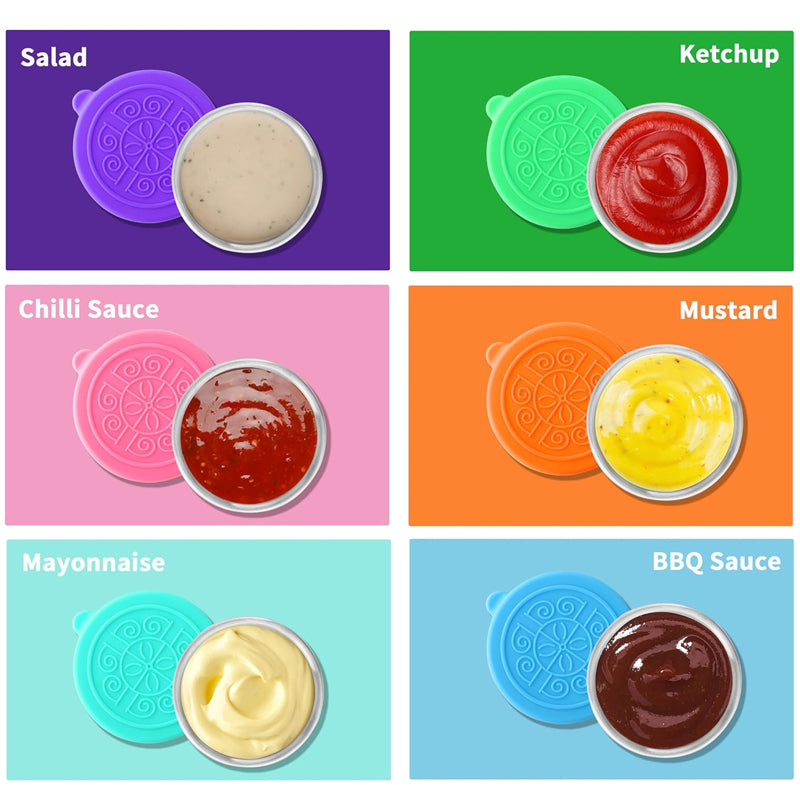 • 🌈 Colorful, Easy-Open Lids for Quick ID:Bright silicone lids make it fun and easy to identify contents at a glance. The soft texture makes opening and closing a breeze—no more sauce confusion during busy mornings!