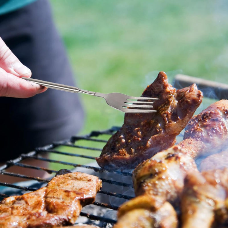 Allsidig bruk: Med sin justerbare lengde fra 21,5 cm til 63 cm / 8,46 tommer til 24,8 tommer, er den teleskopiske uttrekkbare lange gaffelen perfekt for ulike anledninger, fra utendørs grilling til innendørs bespisning.
