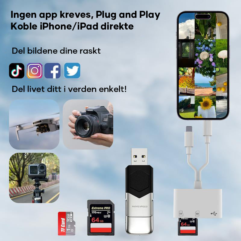 【Plug and play】: Trenger ingen driver, trenger ingen apper, trenger ikke internettforbindelse, bare koble denne microSD-kortleseren til din iPhone/iPad/datamaskin eller andre USB C-enheter og vent i 1-3 sekunder, du kan overføre bilde eller video fra Telefon/nettbrett/PC til SD/TF-kort eller fra SD/TF-kort til telefon/nettbrett/PC. Del deretter gleden din med familie og venner i sanntid.