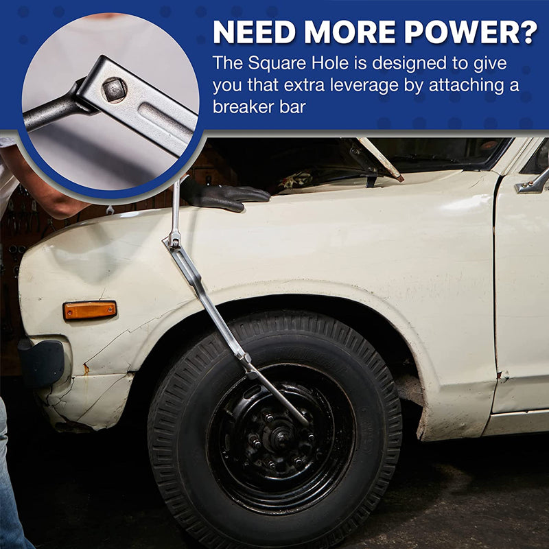 • ๐Ÿ˜ƒ Square Hole: The handle of the tool has a square hole, allowing for attachment of a breaker bar or ratchet. It can also be hung on a hook for easy storage.