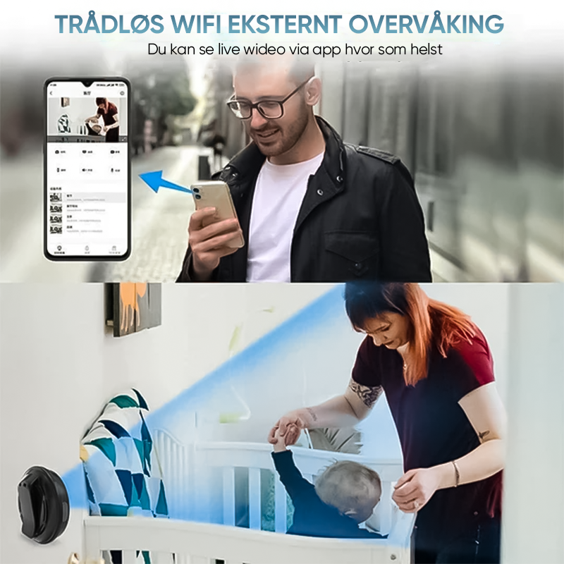 - EKSTERN LIVE FEED - IP-kamera har gratis apper for iOS- og Android-telefoner. Etter at innendørs hjemmekamera er koblet til hjemmets WiFi, kan du se det i sanntid når som helst og hvor som helst. Kameraet har innebygd mikrofon og høyttaler, støtter toveis lydfunksjon, og du kan foreta eksterne samtaler med dine kjære.