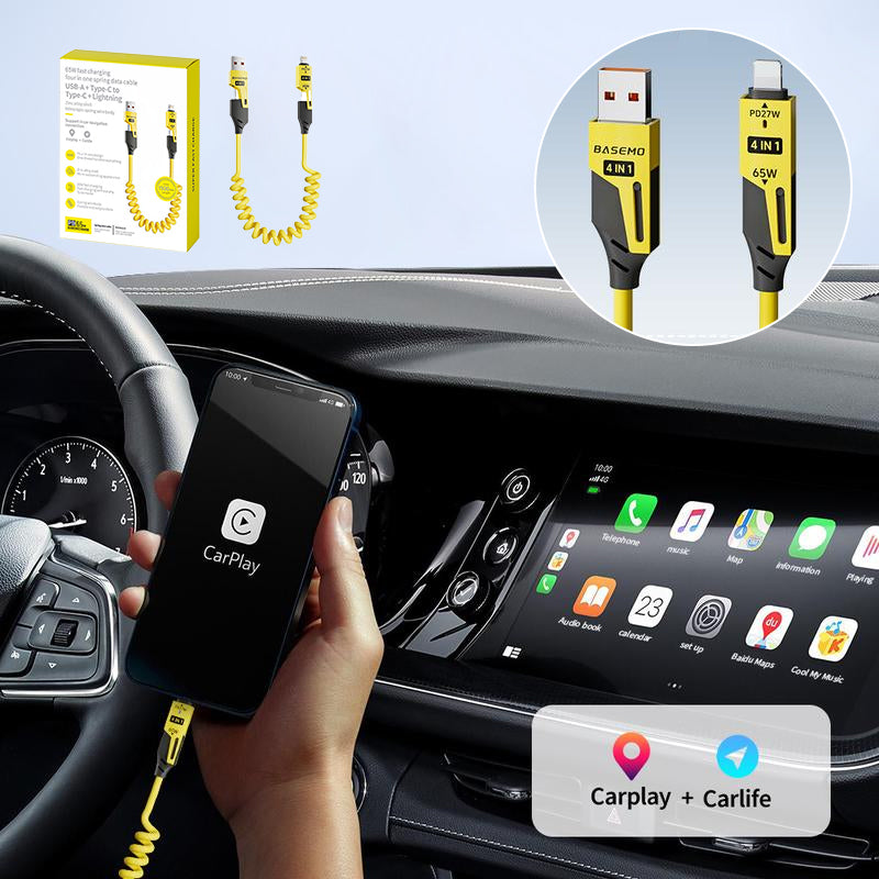 The 4 in 1 Spring Fast Charging Cable features a flexible and durable spring coil design that easily stretches from curled up to 1.5m to prevent cable clutter and tangles.