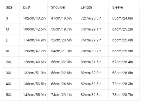 - Size chart: