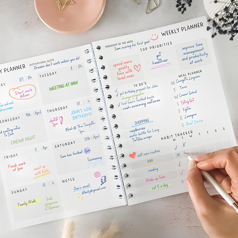 See your week at a glance and stay on course with space for priorities, to do lists, meal planner and habit tracker. -