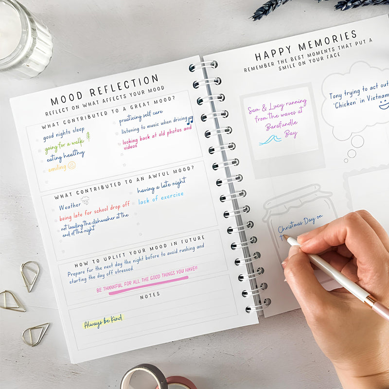 Set meaningful goals, practice self-care rituals, track your mood and sleep. Reflect on the elements that bring positivity into your life and cultivate a well-balanced lifestyle. -